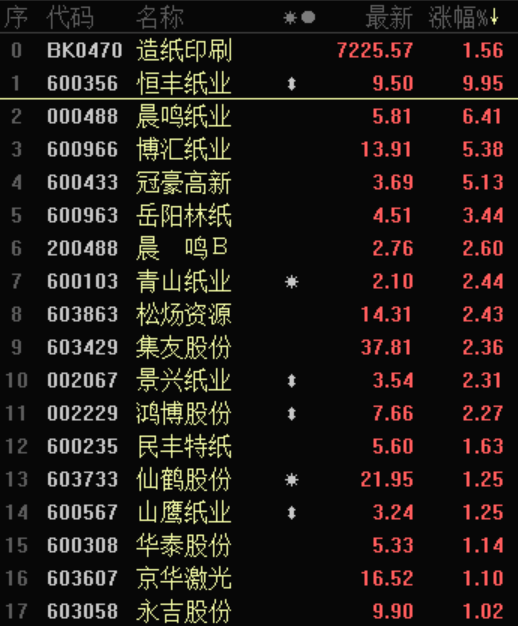 今日纸业成为资金宠儿。期货市场上,纸浆主力合约涨停,涨幅达5%。A股市场上,纸业板块同样表现抢眼。截至收盘,恒丰纸业涨停,晨鸣纸业、博汇纸业、冠豪高新等涨幅超4%,岳阳林纸、集友股份、晨鸣B、景兴纸业等涨幅超2%。