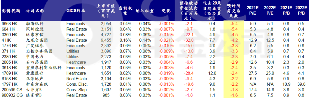 2)所需要交易被动资金流出中,渤海银行、深圳控股、远东宏信、九龙仓集团、广发证券、北控水务集团、中国电力、石四药集团、重庆农村商业银行、爱康医疗、正荣地产、新东方在线等所需要的交易资金流出的时间最长,所需要时间在2天以上,具体细节请参见如下图表。B股中古井贡B和陆家嘴B所需交易的流出时间约为1.8和1.6天。