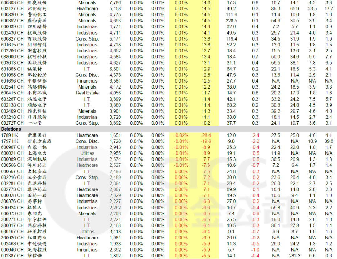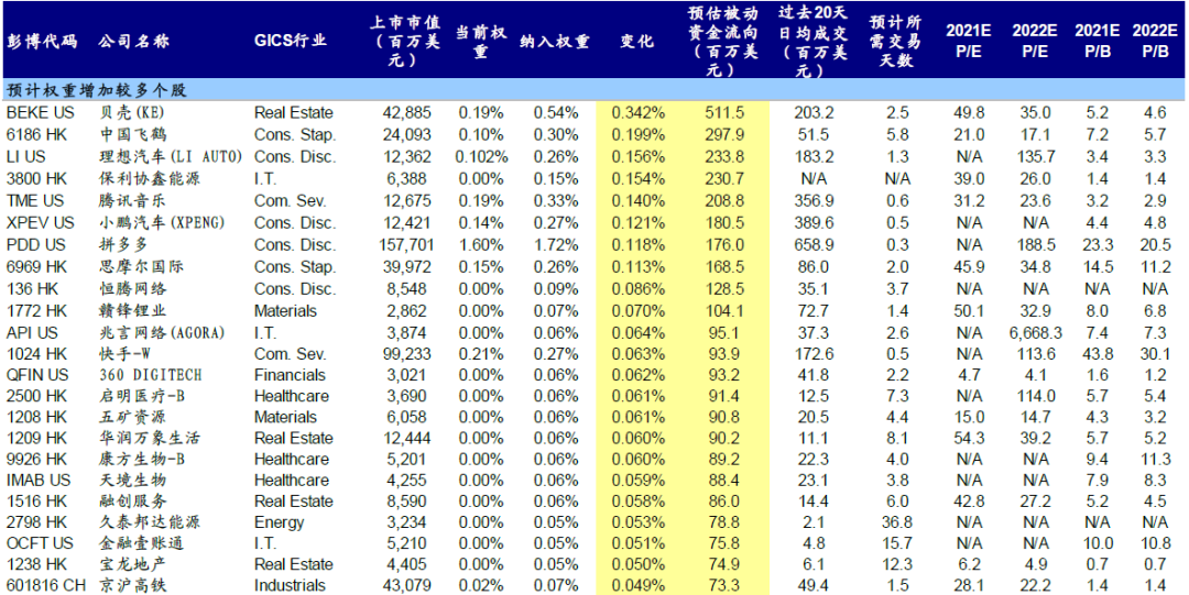 从绝对权重变化幅度来看,我们测算,受此次调整影响,贝壳(KE)、中国飞鹤、理想汽车(LI AUTO)、保利协鑫能源、腾讯音乐、小鹏汽车(XPENG)、拼多多、思摩尔国际、恒腾网络、赣锋锂业等权重增加最多,从0.3%到0.07%不等;其中A股部分权重增加最多为京沪高铁等。