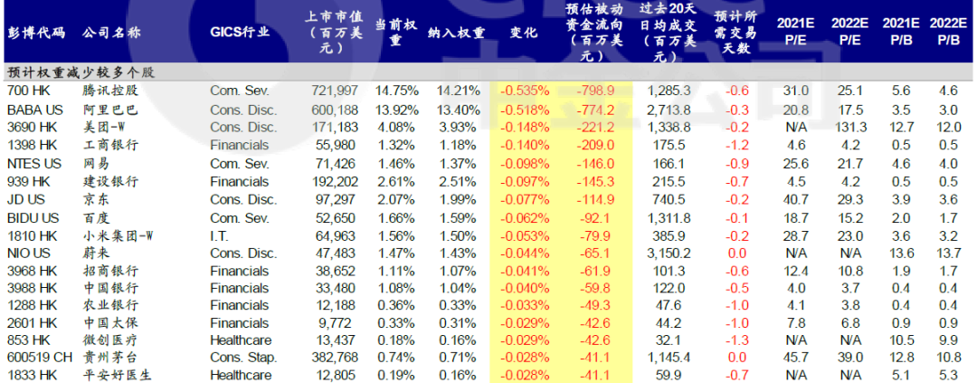 相反,腾讯控股、阿里巴巴、美团-W、工商银行、网易、建设银行、京东、百度、小米集团-W、蔚来等因摊薄效应在指数中权重的下降最大。