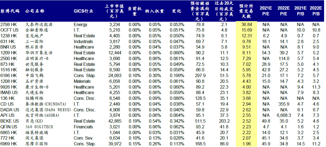 从交易和调仓角度,还需要结合个股的日均成交情况来判断其具体影响。基于当前1494亿美元规模(相当于当前MSCI中国指数整体~3万亿美元市值的5%左右)的被动型基金追踪MSCI中国指数的假设,并结合个股各自过去20天的日均成交金额,我们测算,