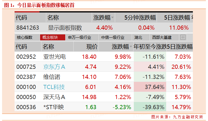 上周电子板块涨幅居前,消费电子个股表现优异,今日面板类个股再度领涨两市。叠加事件催化,Witsview近日发布6月上旬面板价格,32、43、55和65寸电视面板价格全面止跌,超出市场预期。