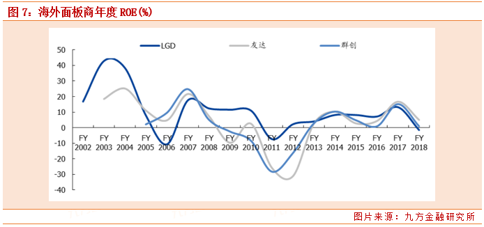 行业景气期,业内公司ROE平均水平能达到约15%。从股本回报率上看,LGD、友达、群创基本也是周期波动,周期景气时的顶点诸如2007年LGD/友达/群创ROE分别为18%/22%/25%,2017年LGD/友达/群创ROE分别为13%/17%/15%。计算中位数(从下表数据起始年份计算)来看,LGD/友达/群创ROE中位数分别为8%/5%/2%。