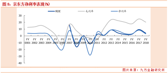 京东方经历长时间蛰伏,ROE水平逐渐修复。京东方在2010年之前ROE表现大幅跑输海外竞争对手,2011年之后ROE趋于2~10%,基本与行业趋势一致。2017年行业景气时,京东方ROE达到9.25%。