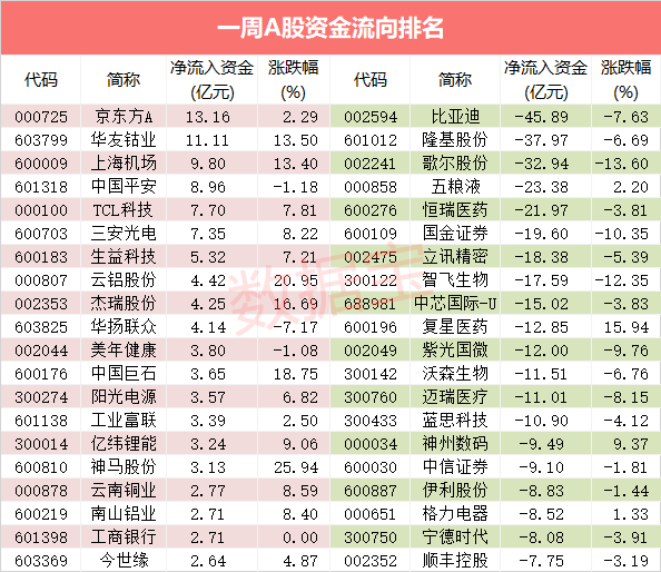 单只股票来看,净流入规模前五位的依次是京东方A、华友钴业、上海机场、中国平安、TCL科技,京东方A净流入规模再次蝉联榜首,净流入资金13.16亿元,该股本周上涨2.29%。据“京东方BOE”微信公众号消息,近日,BOE(京东方)推出55英寸4K主动矩阵量子点发光二极管(AMQLED)显示屏,这是继今年年初发布高分辨率QLED技术后,京东方在电致发光量子点领域取得的又一重大进展。
