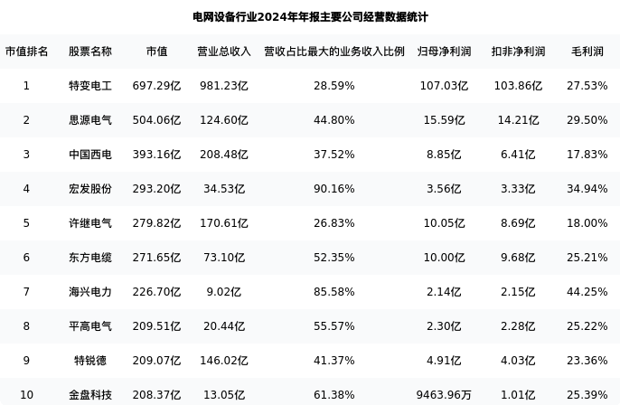 特锐德最新报告期数据为年报,下表汇总了电网设备行业内市值靠前的公司年报主要经营数据