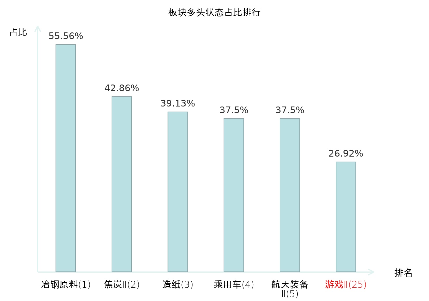全市场所有行业板块中主力多头状态占比排名中,冶钢原料板块位居第一。房屋建设Ⅱ板块名次提升最快,较昨日上升84位。