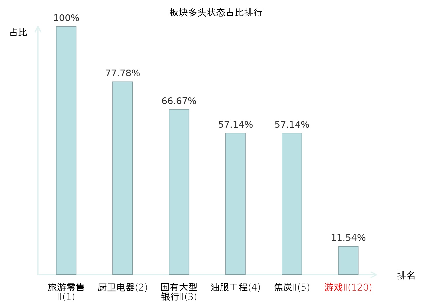 全市场所有行业板块中主力多头状态占比排名中,旅游零售Ⅱ板块位居第一。房地产服务板块名次提升最快,较昨日上升71位。