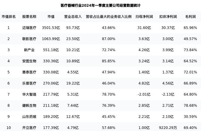 乐普医疗最新报告期数据为一季度,下表汇总了医疗器械行业内市值靠前的公司一季度主要经营数据