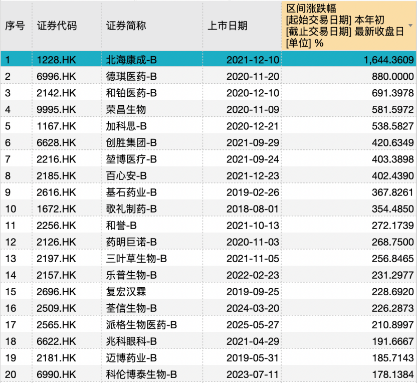 其中,涨幅最大的是北海康成,其涨幅高达1644%,不过,尽管今年以来涨幅巨大,公司目前总市值仍然较小,仅有约11亿港元。消息显示,国家医保局8月12日公布商保创新药目录初审名单中,北海康成三款罕见病产品均通过了商保创新药目录的形式审查,包括今年5月获批上市的用于12岁及以上青少年和成人I型和Ⅲ型戈谢病患者的长期酶替代产品戈芮宁(注射用维拉苷酶β)等。
