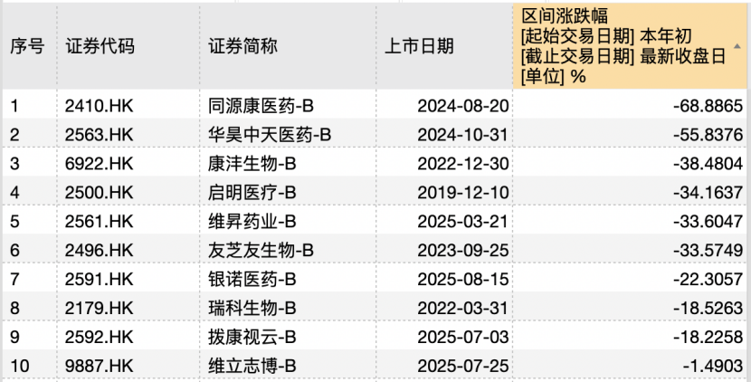 77家18A公司中,股价下跌的仅有10家,跌幅最大的是同源康医药,跌幅超过68%。