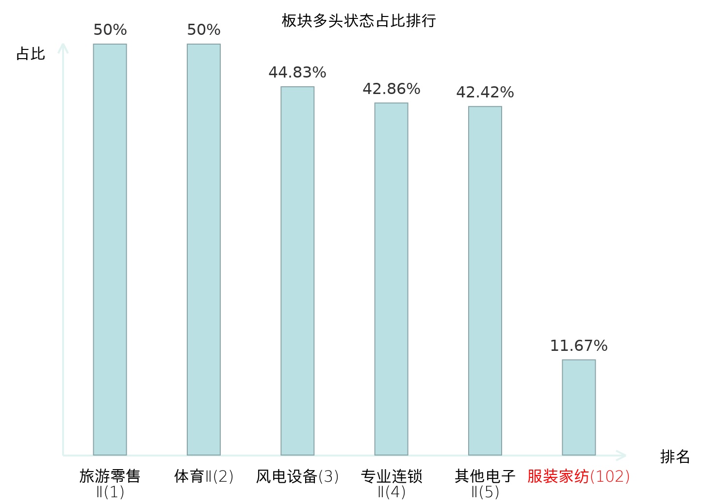 全市场所有行业板块中主力多头状态占比排名中,旅游零售Ⅱ板块位居第一。化妆品板块名次提升最快,较昨日上升66位。