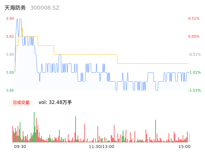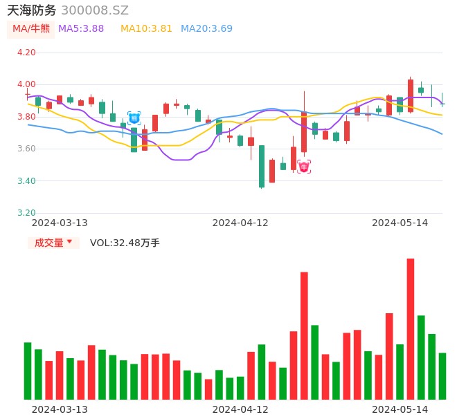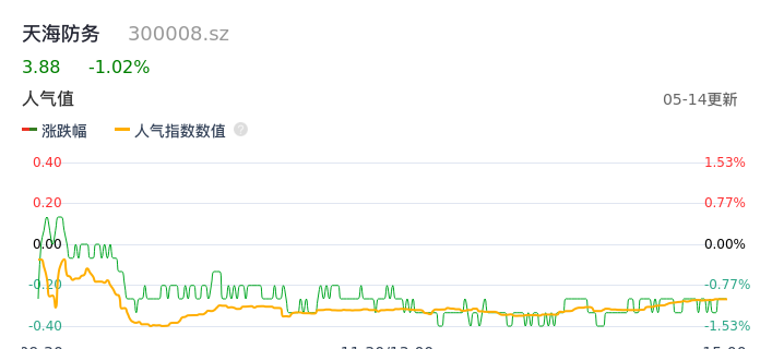 05月14日,天海防务收报3.88,股价涨幅-1.02%,成交金额1.26亿元,换手率1.97%。