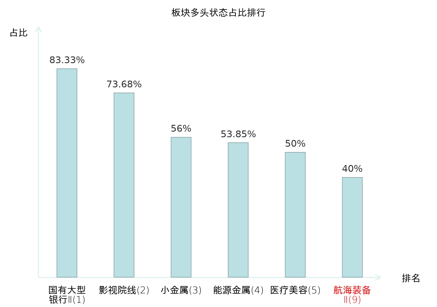 从主力宝信号数据分析,天海防务所属的航海装备Ⅱ板块中共4只股票处于主力多头状态,主力多头状态占比在全行业中排名第9位,较昨日上升12位;较高的排名表明主力对于该板块整体看多意愿较强,此次排名显著上升反映出主力对该板块态度趋于积极;全市场所有行业板块中主力多头状态占比排名中,国有大型银行Ⅱ板块位居第一;电视广播Ⅱ板块名次提升最快,较昨日上升99位;这些变动揭示了主力资金在不同行业间的配置倾向变化,为投资者评估板块相对强度及潜在结构性机会提供了客观依据。