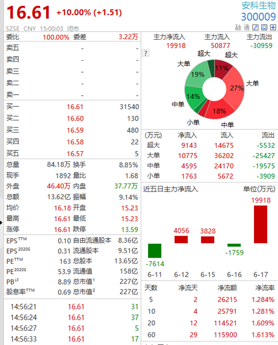 再来看安科生物涨停当天的盘口就很健康,无论从内外盘比、买一的巨量挂单以及主力净流入,都显示出主力的进攻意图,后续持续上涨概率高。
