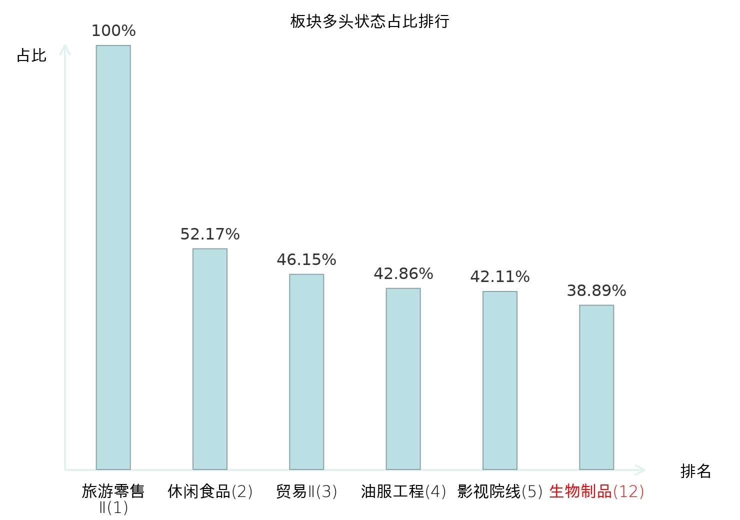 全市场所有行业板块中主力多头状态占比排名中,旅游零售Ⅱ板块位居第一。体育Ⅱ板块名次提升最快,较昨日上升99位。