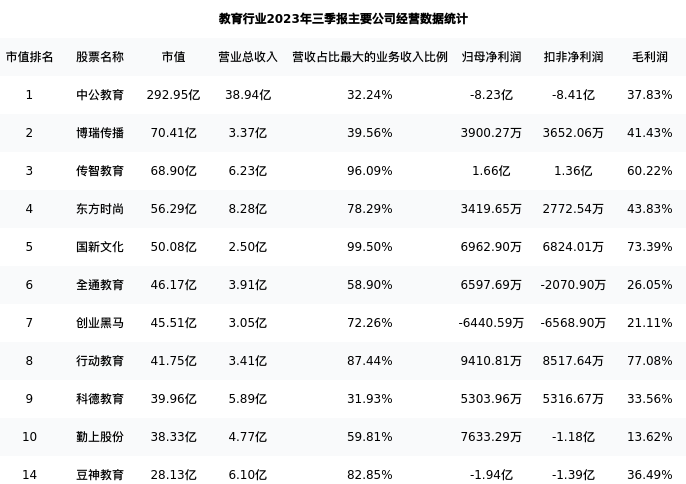 豆神教育最新报告期数据为三季报,下表汇总了教育行业内市值靠前的公司三季报主要经营数据