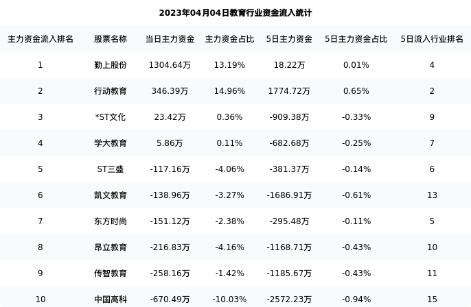 从主力资金流向来看,教育行业今日主力资金流入10.74亿元,在所有申万二级行业中排名:44/131。
