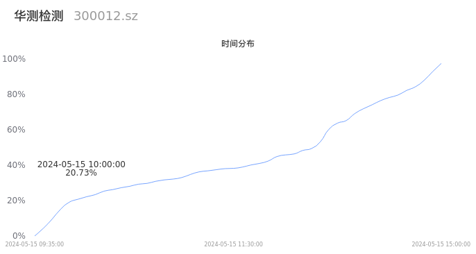 300012华测检测2024年05月15日成交12.33万手,成交金额1.51亿元,相较昨日放量3.34万手,换手率0.86%,成交清淡。