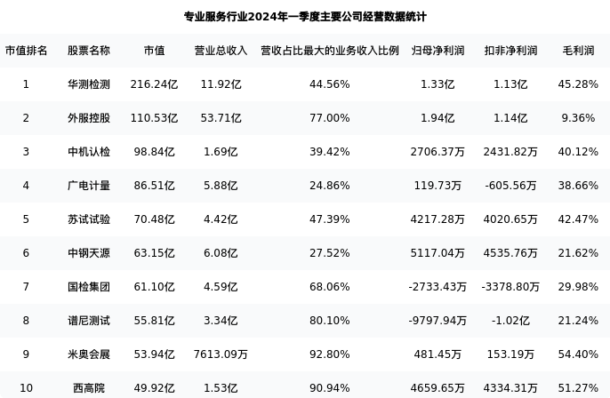 华测检测最新报告期数据为一季度,下表汇总了专业服务行业内市值靠前的公司一季度主要经营数据