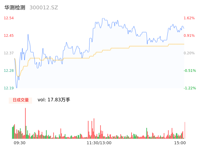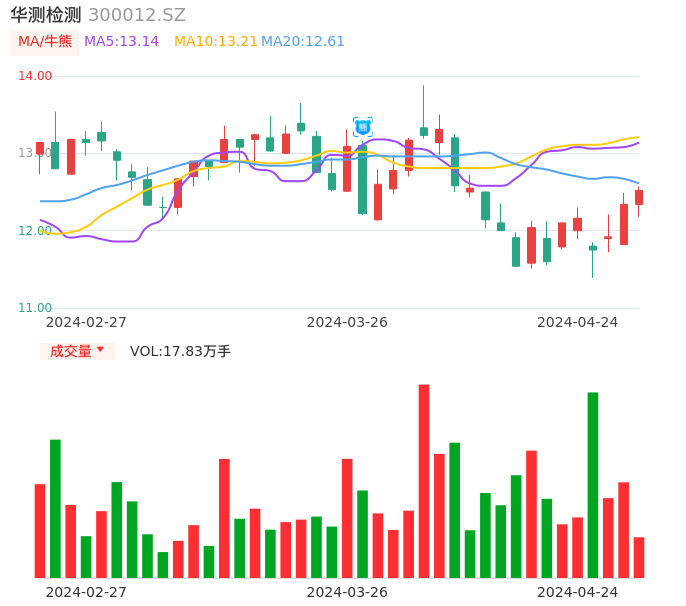 04月24日,华测检测收报12.52,股价涨幅1.46%,成交金额2.21亿元,换手率1.25%。