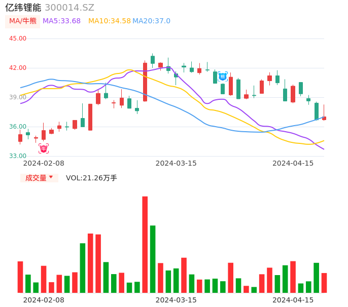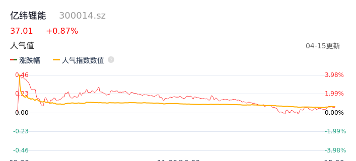 04月15日,亿纬锂能收报37.01,股价涨幅0.87%,成交金额7.95亿元,换手率1.14%。