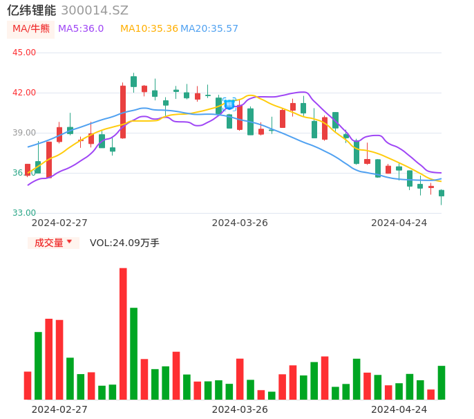 04月24日,亿纬锂能收报34.27,股价涨幅-2.09%,成交金额8.21亿元,换手率1.29%。