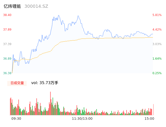 04月29日,亿纬锂能收报37.74,股价涨幅4.00%,成交金额13.44亿元,换手率1.92%。