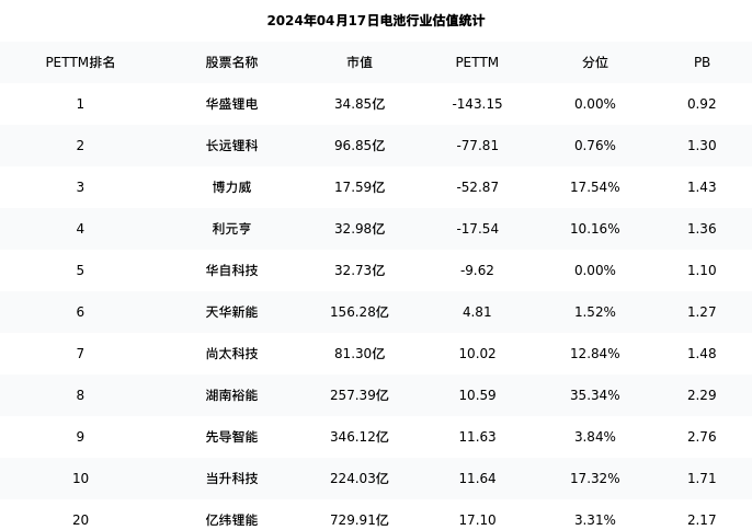从估值角度看:亿纬锂能最新市盈率PETTM为17.10,在行业内排名15/93,处于3.31分位。