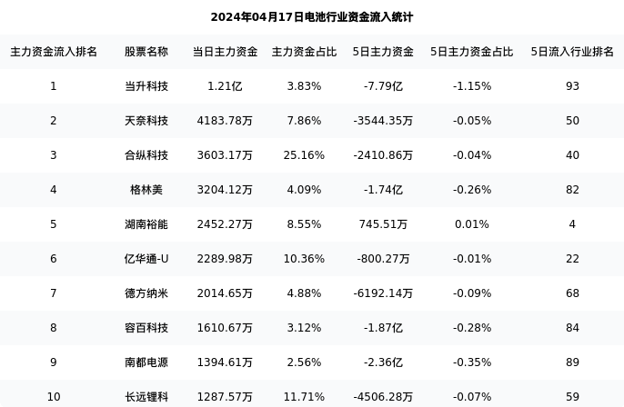 从主力资金流向来看,电池行业今日主力资金流入83.80亿元,在所有申万二级行业中排名:99/131。