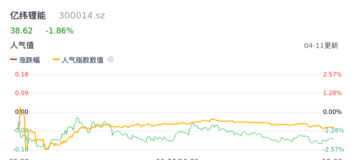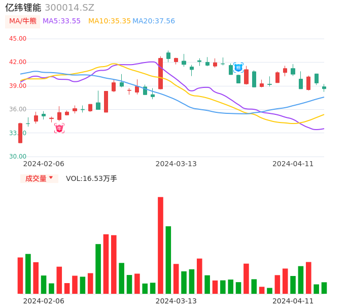 04月11日,亿纬锂能收报38.62,股价涨幅-1.86%,成交金额6.40亿元,换手率0.89%。