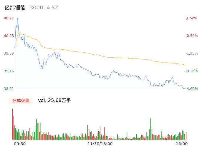 04月08日,亿纬锂能收报38.61,股价涨幅-4.60%,成交金额10.10亿元,换手率1.38%。