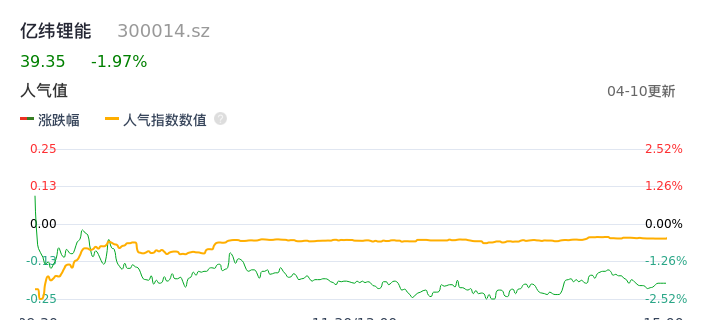04月10日,亿纬锂能收报39.35,股价涨幅-1.97%,成交金额6.07亿元,换手率0.82%。