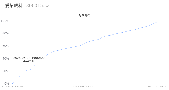 300015爱尔眼科2024年05月08日成交75.34万手,成交金额9.80亿元,相较昨日放量10.39万手,换手率0.95%,成交清淡。