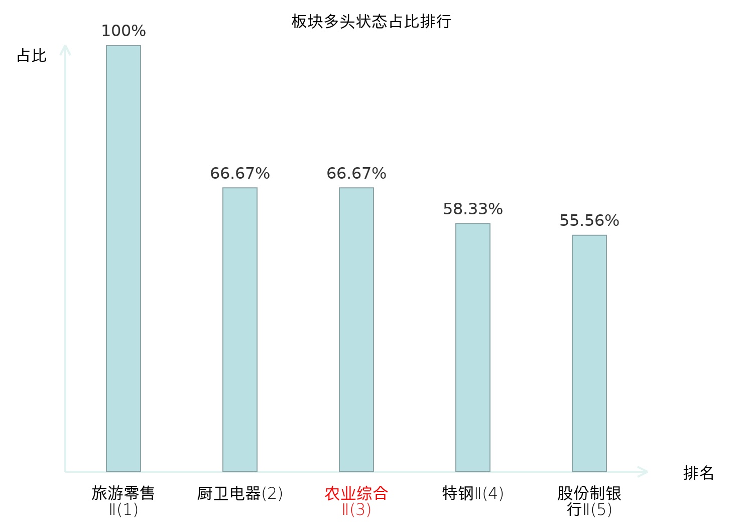 全市场所有行业板块中主力多头状态占比排名中,旅游零售Ⅱ板块位居第一。农商行Ⅱ板块名次提升最快,较昨日上升78位。