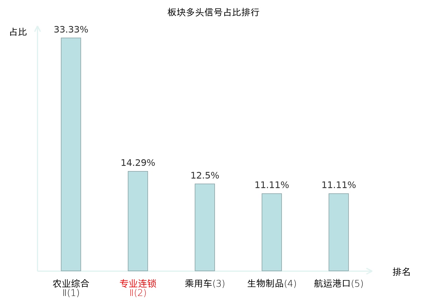 全市场所有行业板块中主力多头信号占比排名中,农业综合Ⅱ板块位居第一。专业连锁Ⅱ板块名次提升最快,较昨日上升122位。