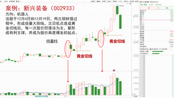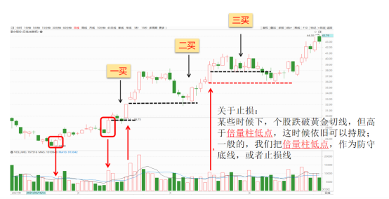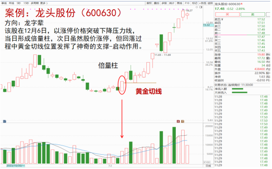 需要注意的是,实战中,并不是每根黄金切线,都会出现上涨,有时也会出现回落。而一旦个股跌破了黄金切线的时候,风险就会出现,此时就要优先防守,准备止损。黄金切线战法中,对于止损定义的描述,是以日线收盘价跌破临近倍量柱的低点作为参考。