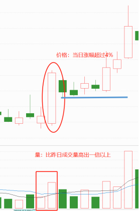 倍量柱的要求:股价涨幅超过4%以上,越大越好;量能超过前一根K线量能的一倍以上。
