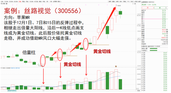 比如近期因苹果MR概念大幅走强的丝路视觉,股价12月1日、7日和15日的反弹过程中,相继完成突破下降压力线、突破箱体、突破箱体的动作,确认转强信号,并于当日形成倍量柱。在每一根倍量柱K线次日低点连直线,确认黄金切线。我们看到,每一次当股价跌至切线附近的时候,都能触发股价上涨,此后该股在板块风口加持下,股价掀起一波上升趋势。