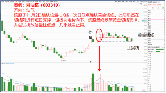 当然,任何方法都没有100%的胜率,黄金切线也不例外。同样在11月,湘油泵上涨中确认倍量柱,但股价仅仅得到短期支撑后便迅速下行,然后跌破黄金切线、倍量柱低点支撑,触发止损。如果你对于当时行情比较熟悉的话,一定不难发现,湘油泵属于油气概念,在这一阶段中不是市场风口。这是它没有走强的关键原因!