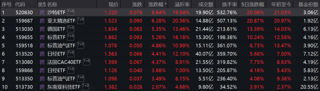 其中,10只跨境ETF换手率超过100%,沙特ETF(520830)、亚太精选ETF早盘换手率超过500%;两只ETF规模较小,分别为3.1亿元、2.41亿元,早盘成交额却在10亿元以上。