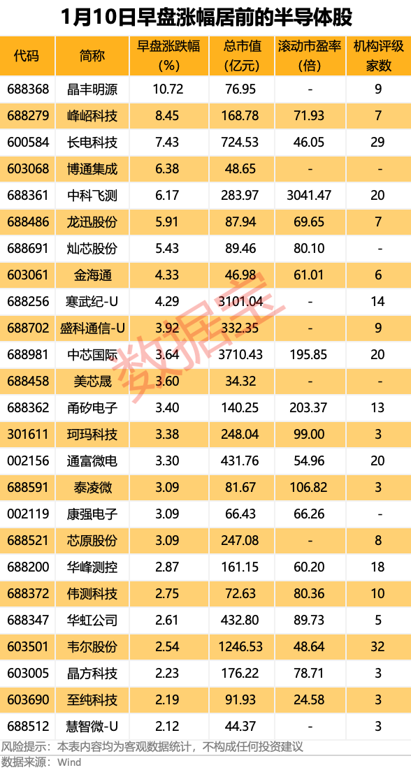 早盘,半导体板块平开高走,行业指数盘中最高上涨3.16%,午间收盘涨1.13%。个股中,晶丰明源、峰岹科技、长电科技涨幅居前,均超过7%。