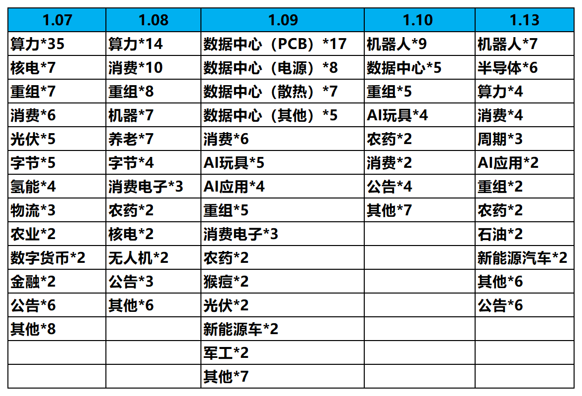 涨停板块数据;现在处于题材的混沌期,大家各拉各的,没有向心力,也很难形成大趋势。这段时间是往往是短线最难做的一段时间,你没有先手,就很难赚钱。比如,今天开盘拉机器人,中午跳水,下午拉消费、半导体,都是冲高回落。现在市场正在不断尝试新题材,同时淘汰老题材,洗盘结束后,市场会最终形成一个共识,走出像算力、机器人这样的主线。我们耐心等待。