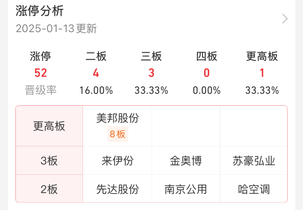 从今天的涨停家数数据来看,大家就能明白现在市场的关键点是没有人愿意拉升了。涨停家数急剧萎缩,连板高度也大幅压缩,美邦8板,3个三连,3个两连板。上周就说过操作保守点,马上春节了,资金做多意愿不强。