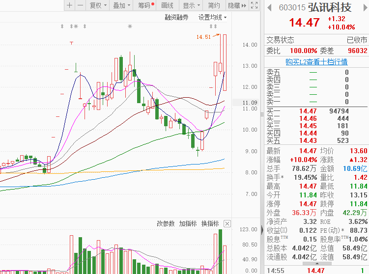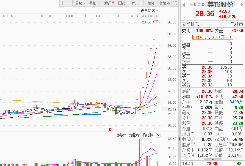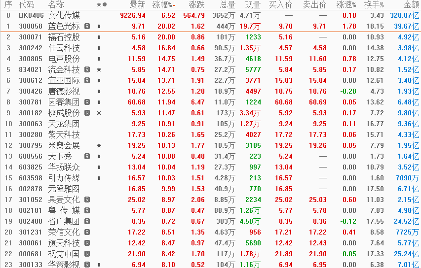 市场情绪,今日放量回暖,个股普涨,全市场超5300只个股上涨,下跌个股不足40只,上涨个股家数创去年10月8日以来新高,逾300股涨停或涨超10%,连板股总数16只,29股封板未遂,封板率为82%(不含ST股、退市股),无下跌板块。焦点股方面,美邦股份T字板晋级9连板,昨日“地天板”的康盛股份、来伊份均高开高走涨停。此外,弘讯科技上演“地天板”行情,走出6天5板。