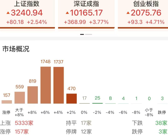 市场全天高开高走,创业板指领涨,沪指收复3200点,北证50指数涨超10%。截至收盘,沪指涨2.54%,深成指涨3.77%,创业板指涨4.71%。沪深两市全天成交额1.35万亿,较上个交易日放量3843亿。盘面上,热点轮番活跃,机器人概念股再度爆发,三花智控等30余股涨停;小红书概念股集体大涨,壹网壹创等多股涨停;大金融股展开反弹,国盛金控等涨停。板块方面,人形机器人、小红书概念、抖音概念、互联网金融等板块涨幅居前,无下跌板块。