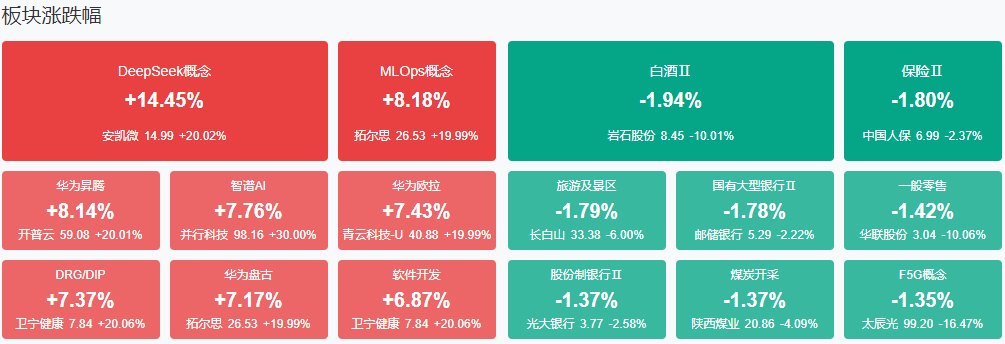 板块方面,DeepSeek概念、算力租赁、AI智能体、贵金属等板块涨幅居前,CPO、休闲食品、民航、高速连接器等板块跌幅居前。截至收盘,沪指跌0.36%,深成指涨0.44%,创业板指涨0.5%。