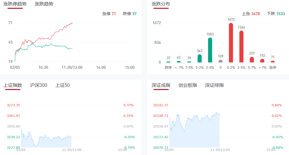 市场早盘震荡分化,创业板指领涨。沪深两市半日成交额8651亿,较上个交易日放量1311亿。盘面上热点集中于AI应用端以及机器人概念两大主线,个股总体涨多跌少,全市场超3600家个股上涨。从板块来看,DeepSeek概念集体大涨,每日互动、南威软件等多股涨停;算力租赁、云计算概念活跃,杭钢股份、优刻得等多股涨停;机器人概念反复活跃,兆威机电、鸣志电器等涨停。下跌方面,算力硬件股延续调整,CPO、铜连接方向领跌,沃尔核材、长飞光纤等跌停,新易盛、天孚通信跌超15%。