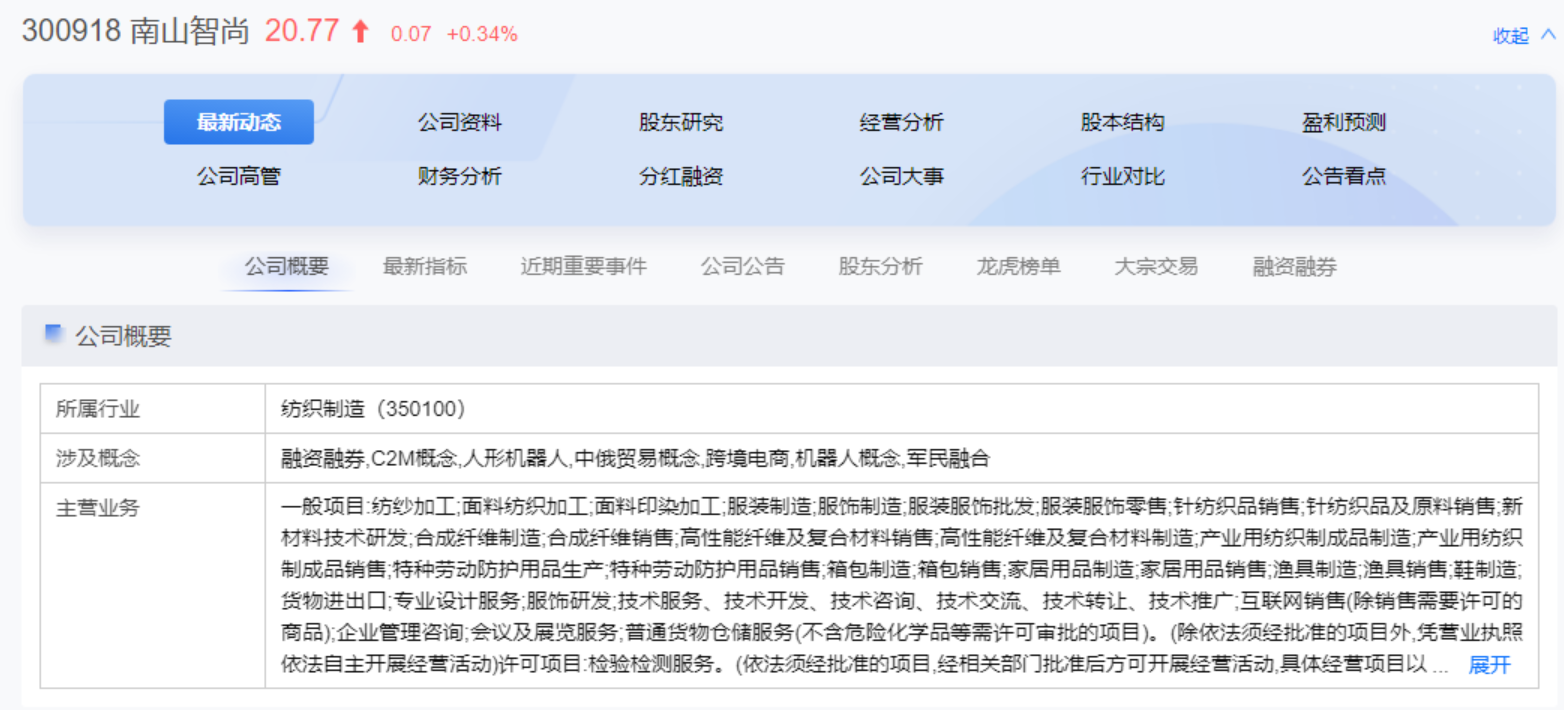 今天为大家带来的是南山智尚,我们先来了解一下这家公司是做什么的,我们通过公司概要可以清楚的看到:公司所属行业是纺织制造。