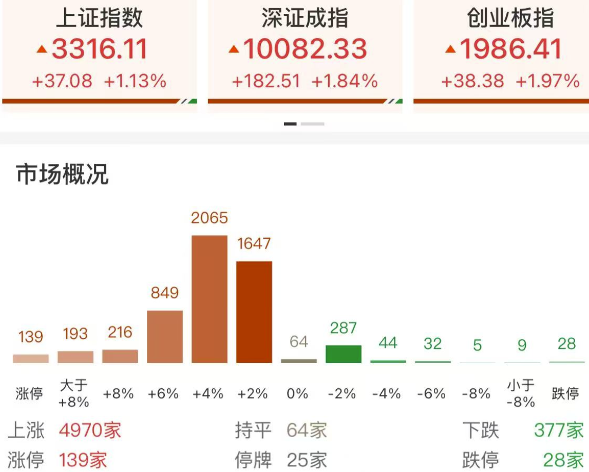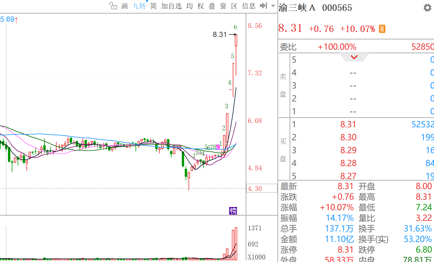 市场情绪上,市场热点良性轮动,个股涨多跌少,全市场近5000只个股上涨;今日共100股涨停,连板股总数18只,21股封板未遂,封板率为83%(不含ST股、退市股)。焦点股方面,渝三峡A晋级5连板,成为市场高度板;精进电动超预期走出20CM3连板;烯草酮价格再度上涨,先达股份9天6板,股价创近2年来新高。